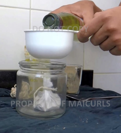 Pouring 1.5 cups of Grapeseed oil over Amla bag